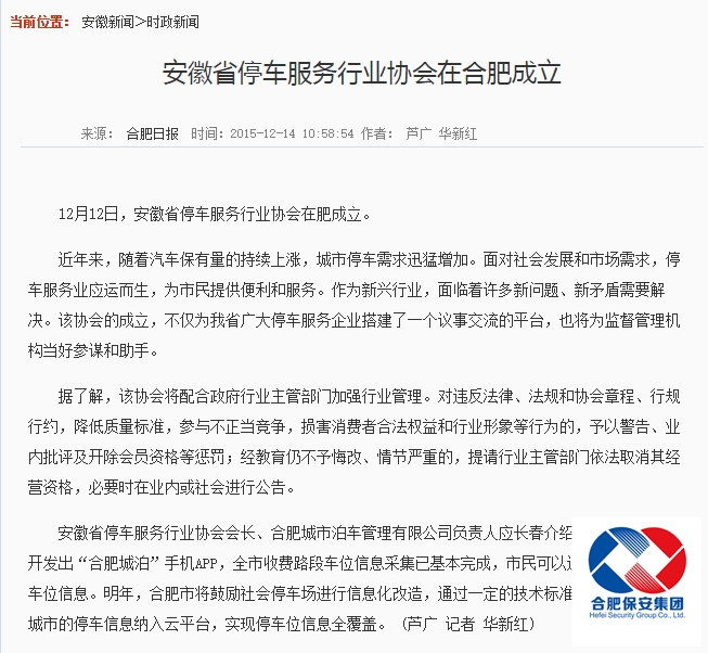 合肥日报报道安徽省停车服务行业协会成立